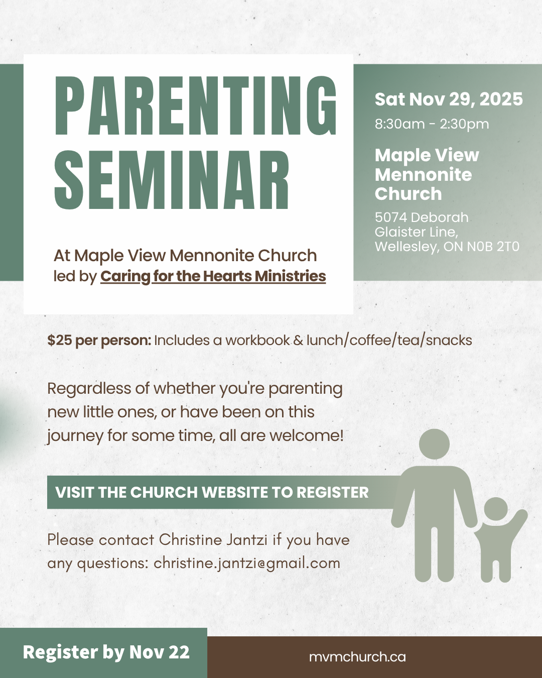 November 29th from 8:30am-2:30pm at Maple View, led by Caring for the Heart Ministries. The cost is $25 per person, includes a workbook & lunch/coffee/tea/snacks.